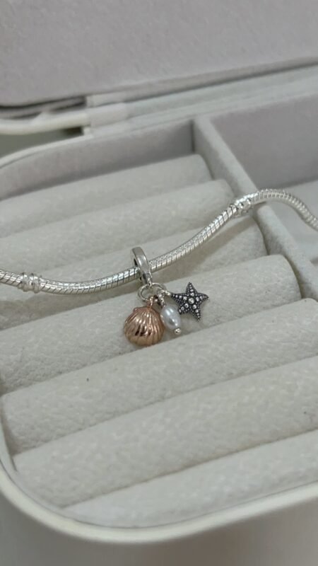 Contem uma estrela em prata envelhecida ,,uma pérola e uma concha rose gold .