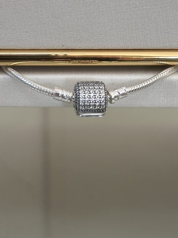Acabado à mão em prata de lei (PRATA 925), o fecho em forma de TAMBOR da pulseira é coberto por um pavé de zircônias cúbicas brilhantes em um dos lados.